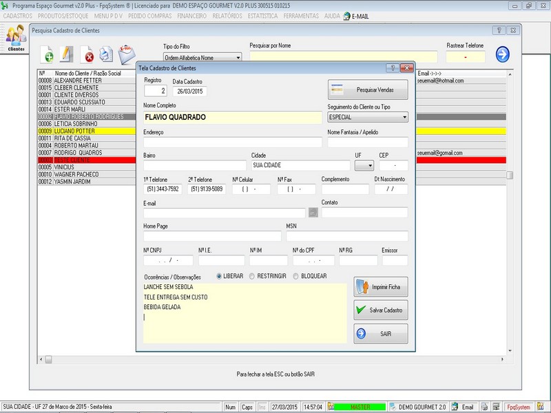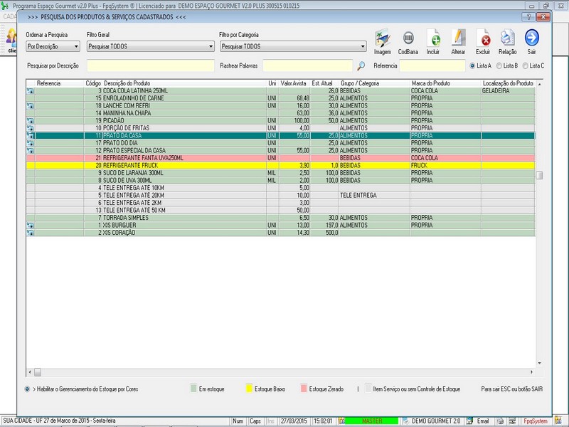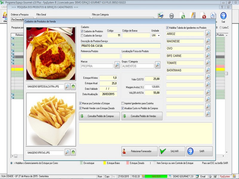 Controle de Estoque / Mesas / Espaço Gourmet / Clientes + Foto dos Clientes / Fornecedores / Vendedores / Relatório de Vendas / Pedido Cupom / Pedido Cozinha / Aniversariantes / Personalizar Fundo de Tela / Personalizar Logomarca + Acesso por nivel de usuario  + Compras + Financeiro + Foto nos Produtos + Reajuste de Preços em bloco + Recibo de Pagamento