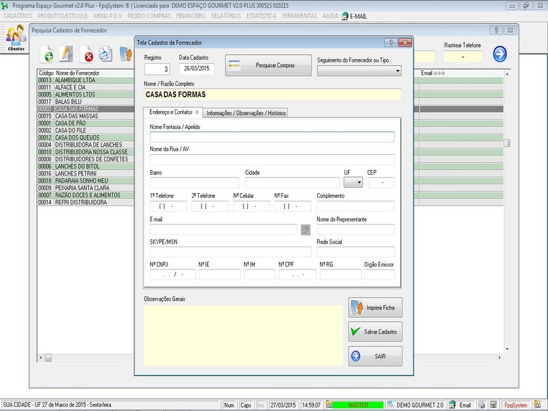 Tela Cadastro Fornecedor