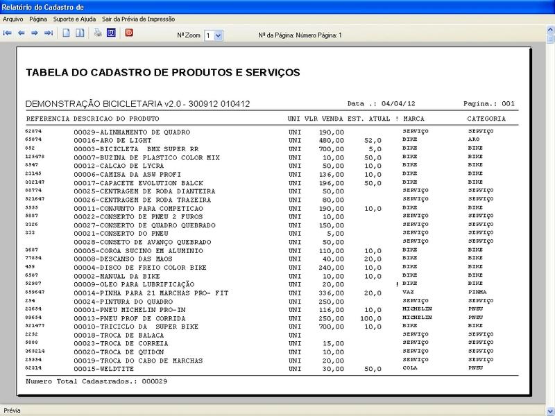 das Bicicletas / Relatório do Cadastro / Tabela de Produtos e