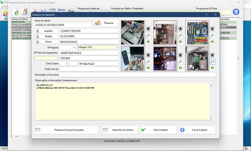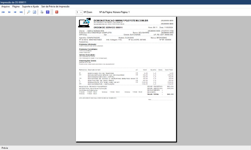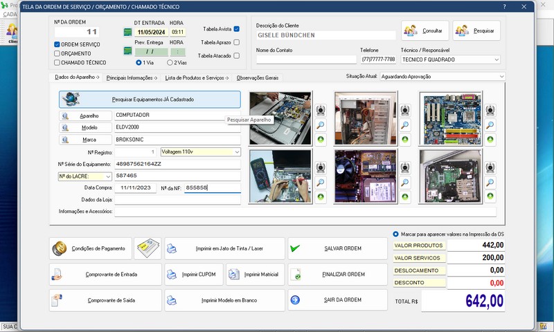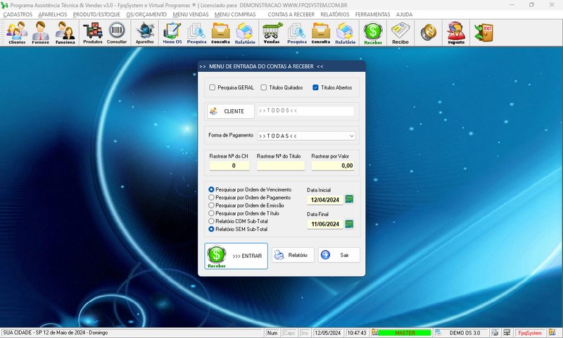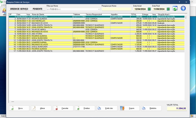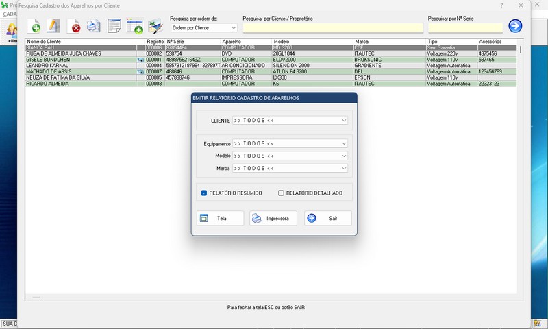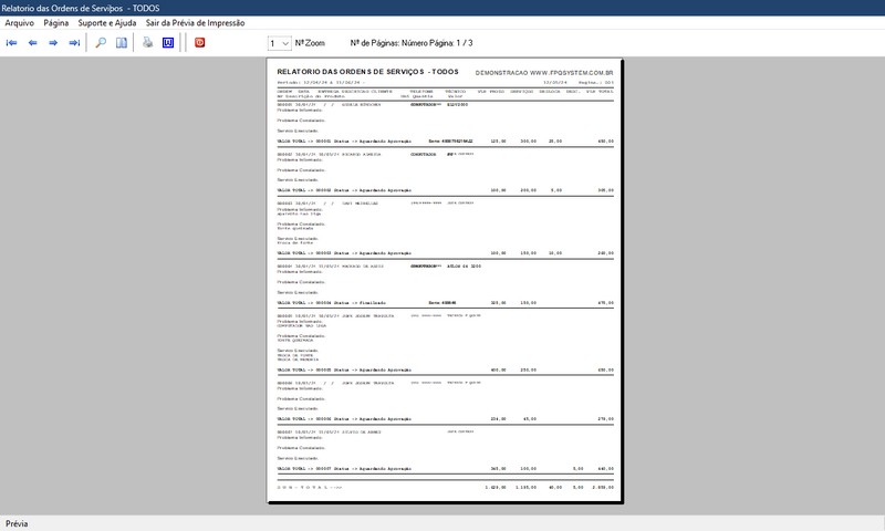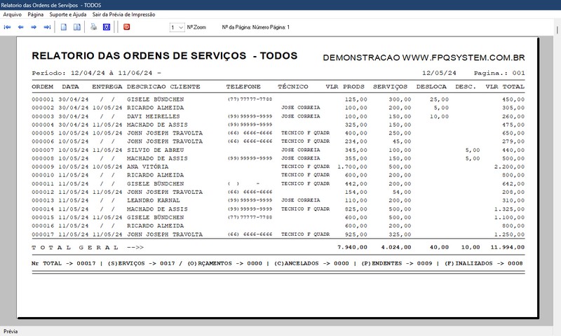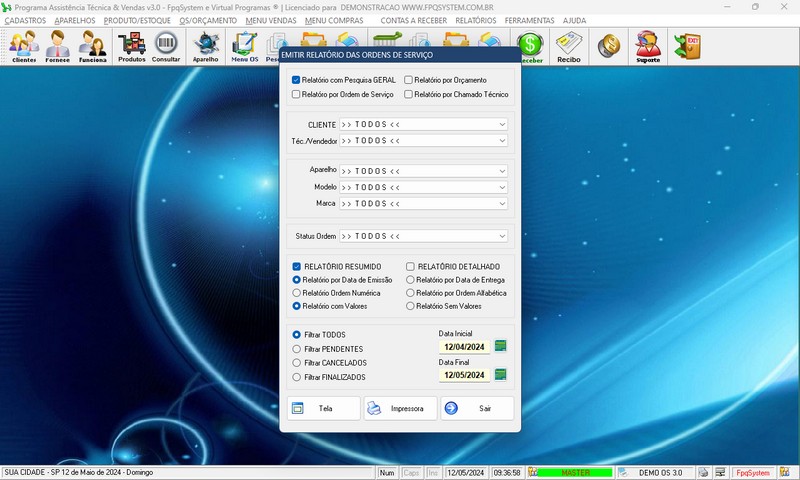 de Serviço / Orçamento / Clientes / Fornecedores / Técnicos / Relatório