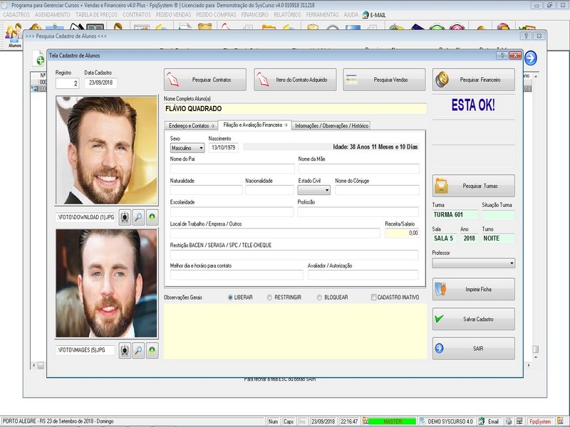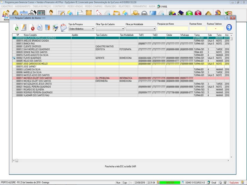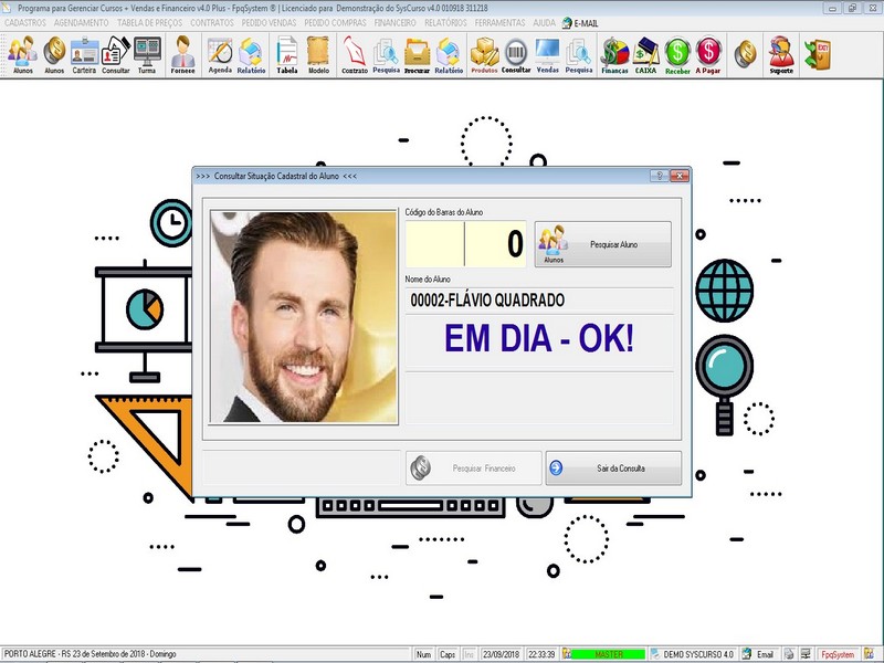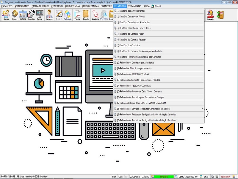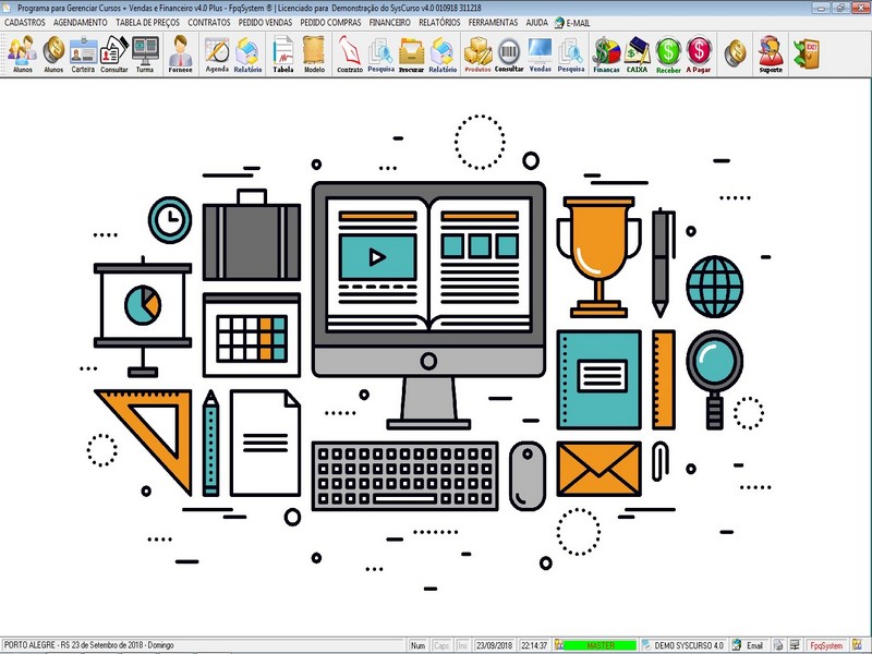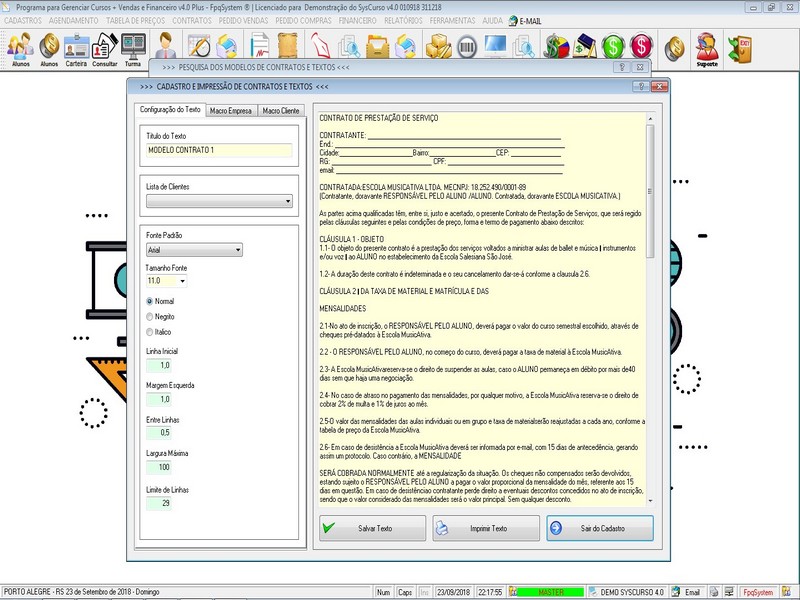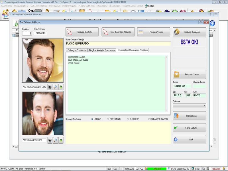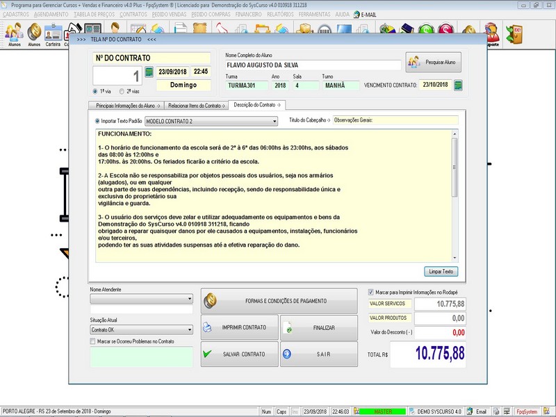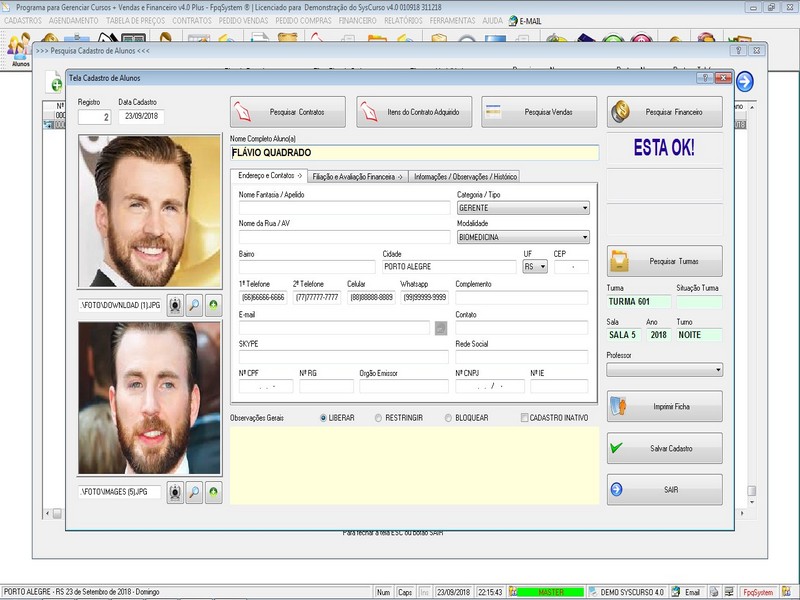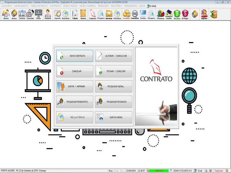 Contratos / Cadastro de Alunos com foto / Professores / Cadastro de Turmas / Agendamento / Aniversariantes /
