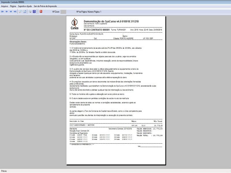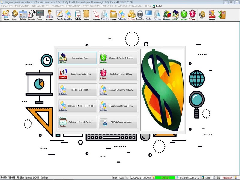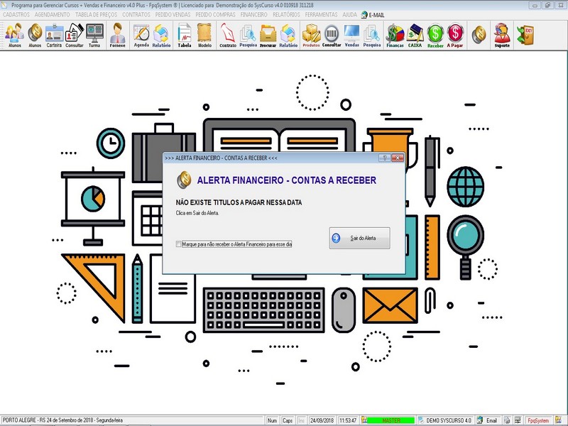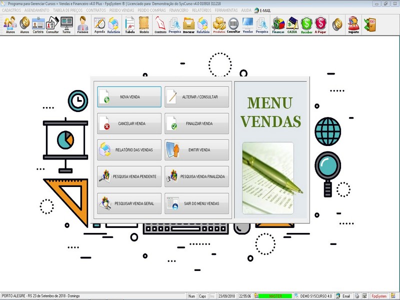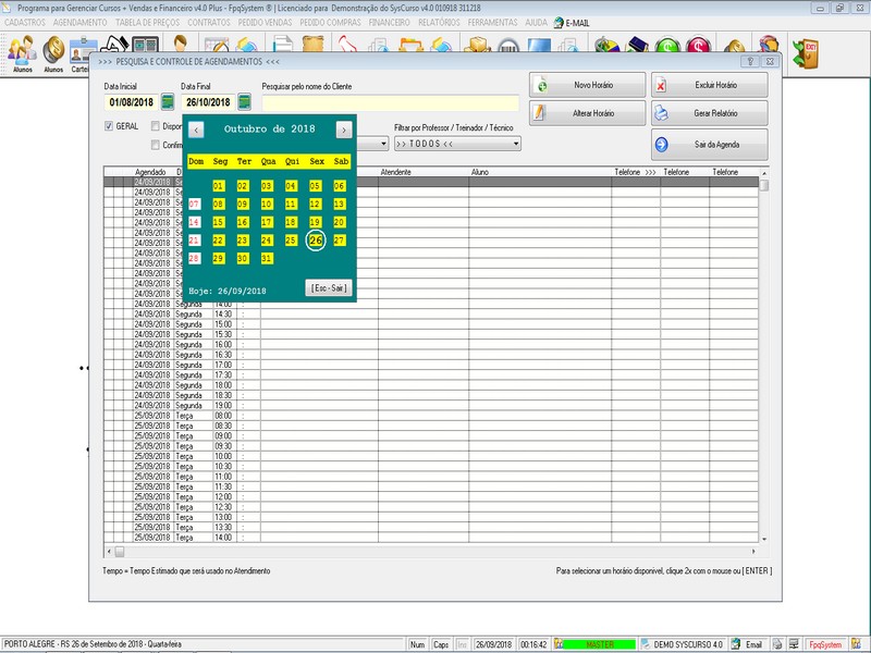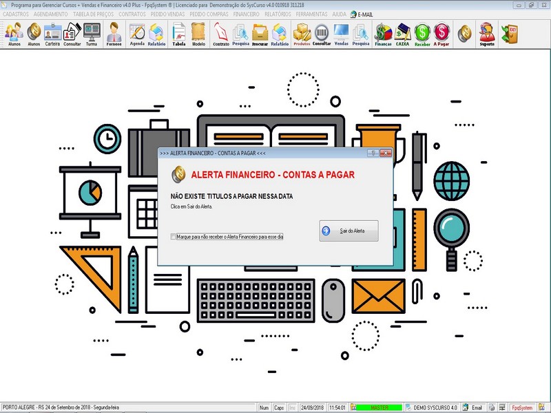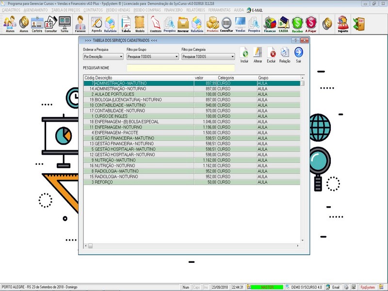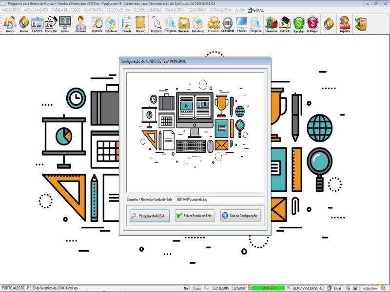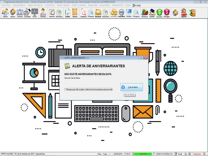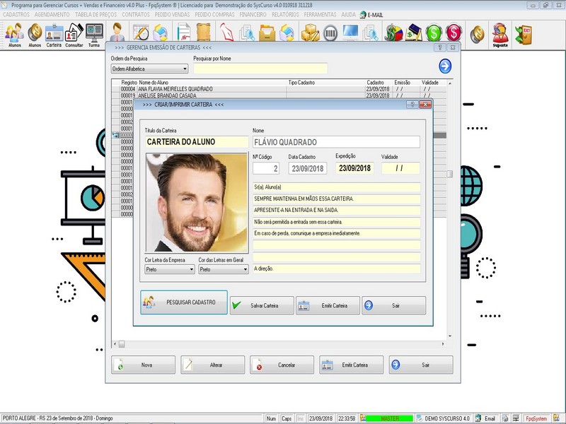 Contratos / Cadastro de Alunos com foto / Professores / Cadastro de Turmas / Agendamento / Aniversariantes /