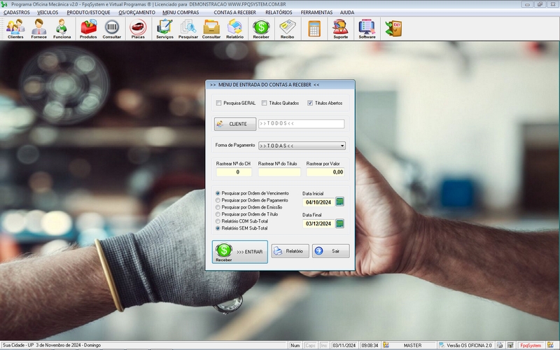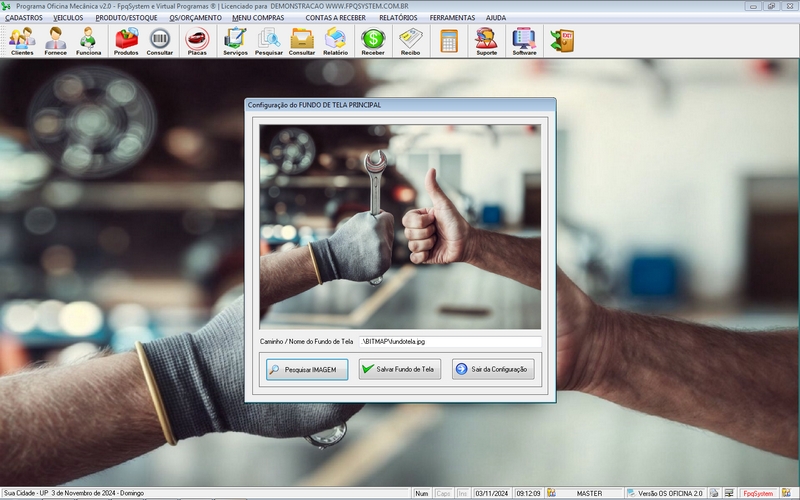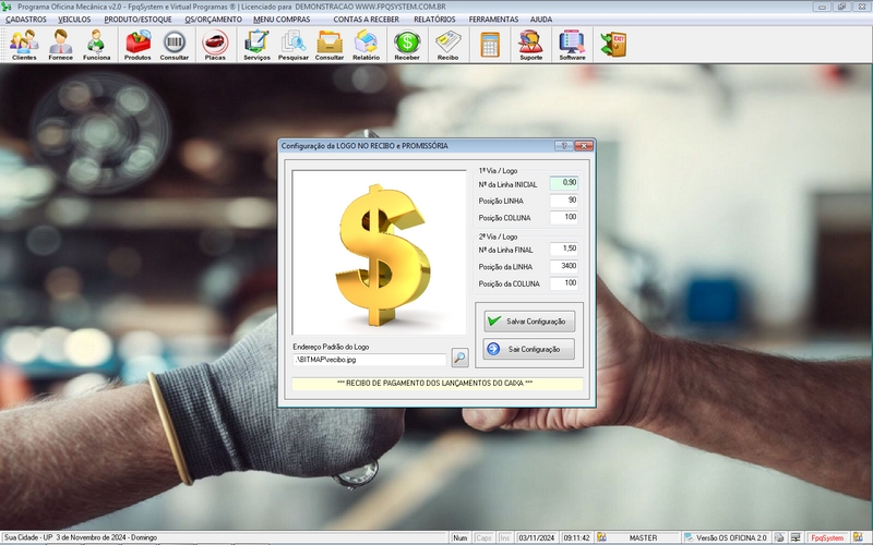Receber / Cadastro de Peças e Serviços / Personalizar logomarca / Recibo de Pagamento / Personalizar Fundo Tela + Acesso por senha