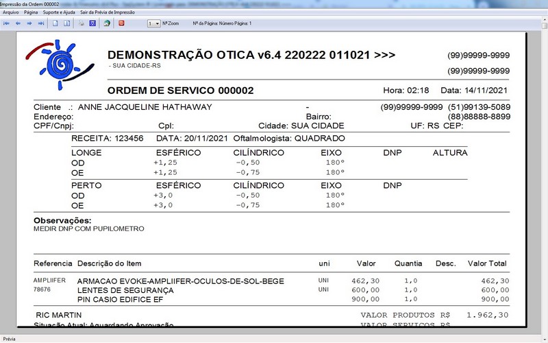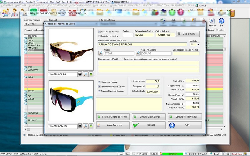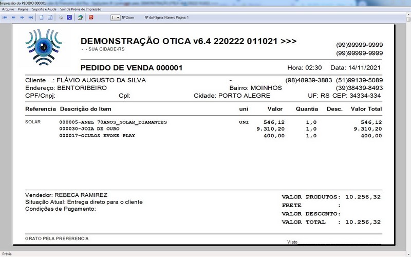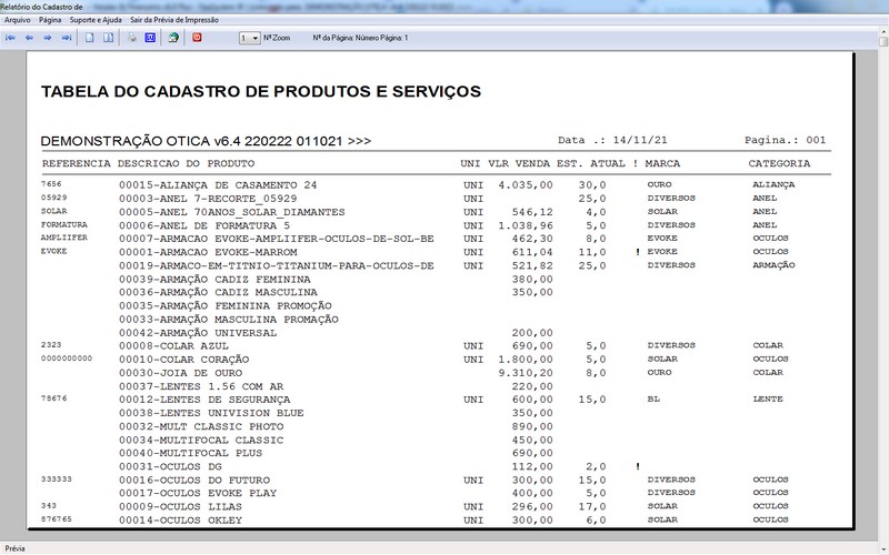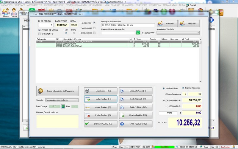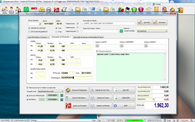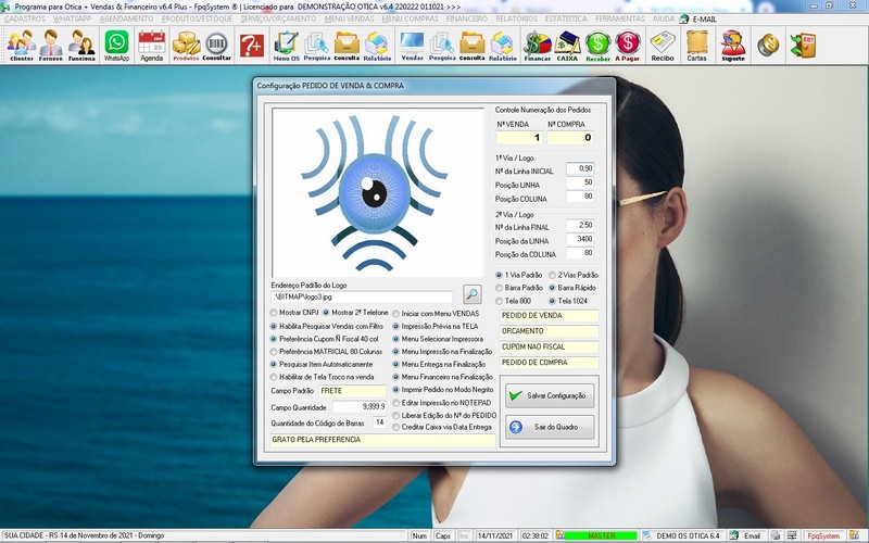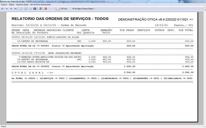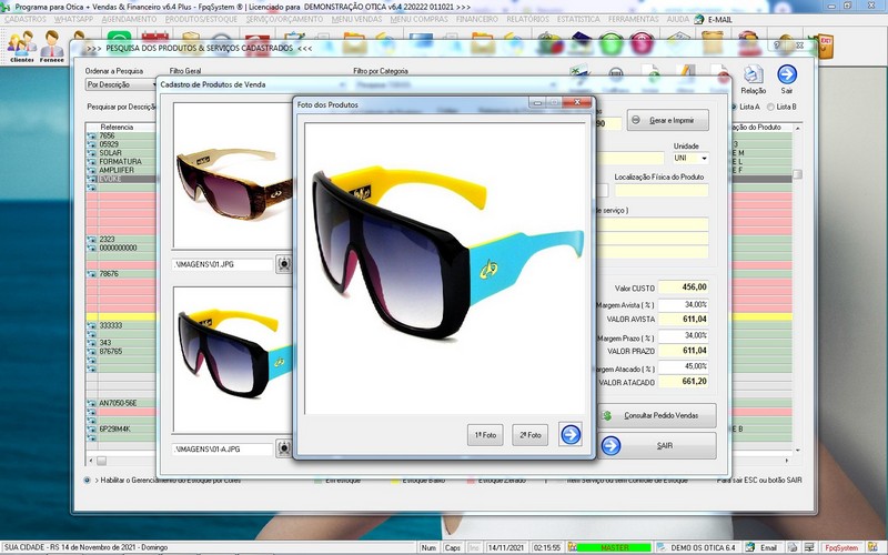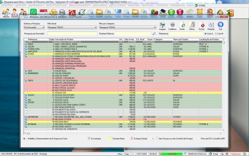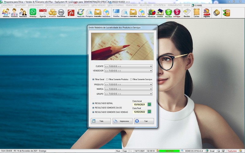 para Ótica e Relojoalheria, Serviços, Vendas, Financeiro e Estatística