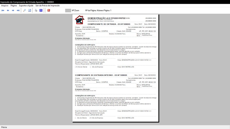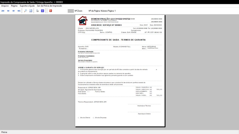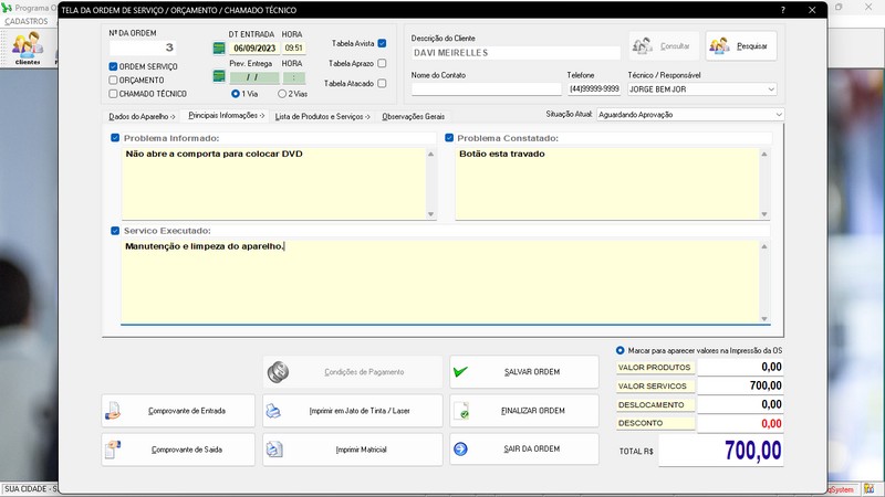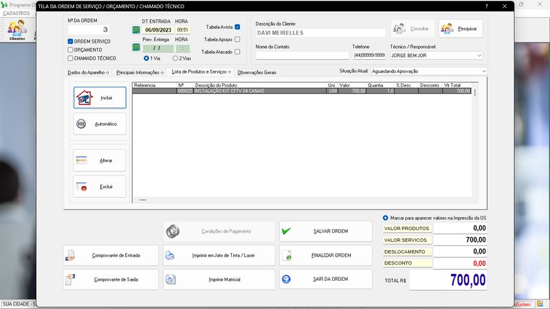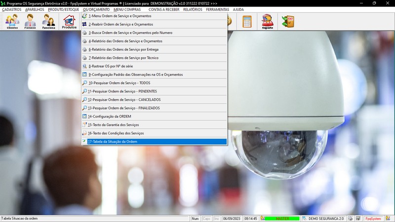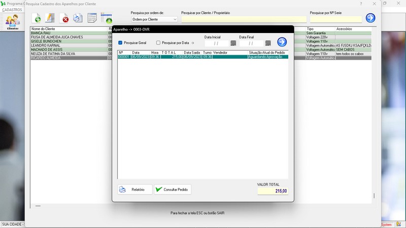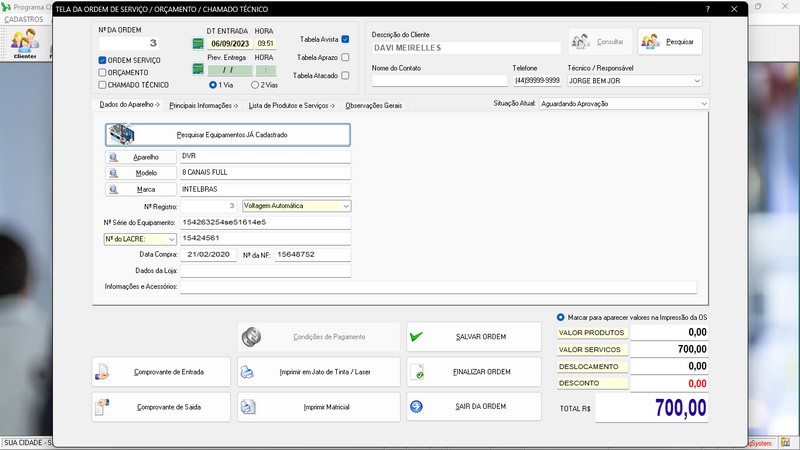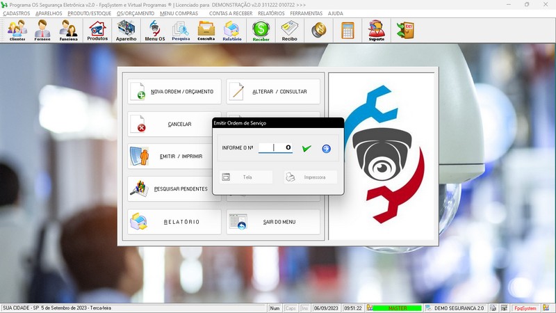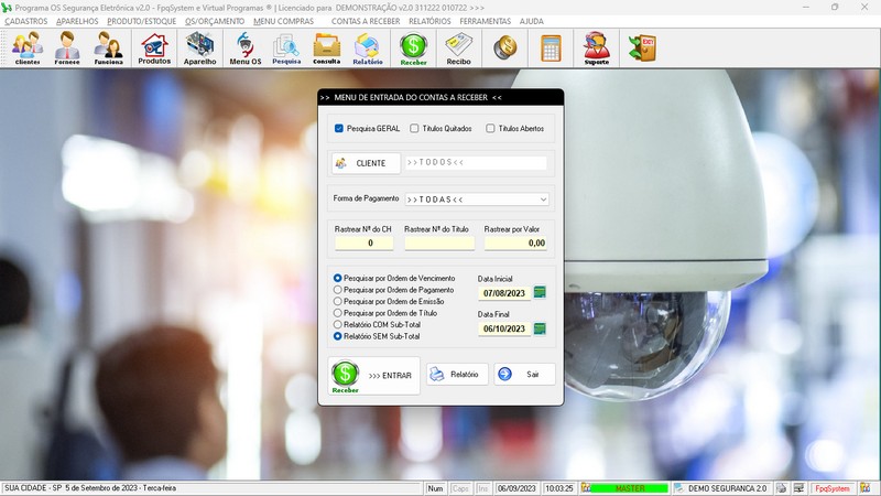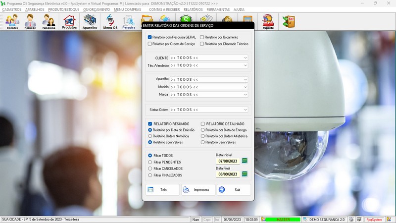 de Serviço / Orçamento / Clientes / Fornecedores / Técnicos / Relatório