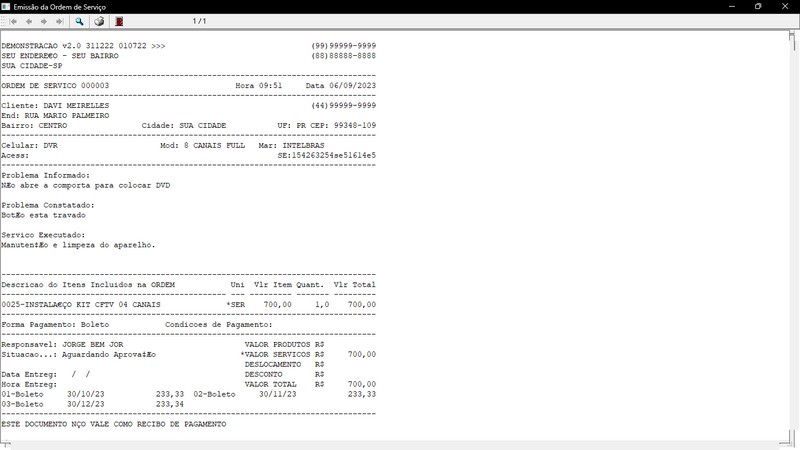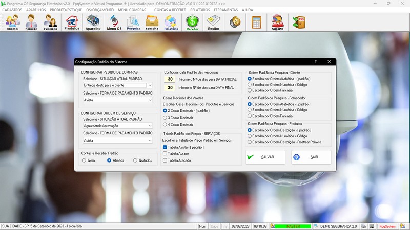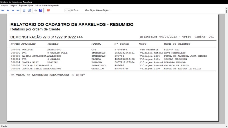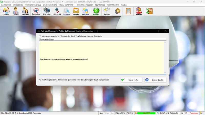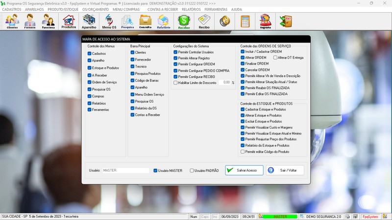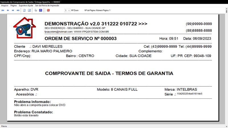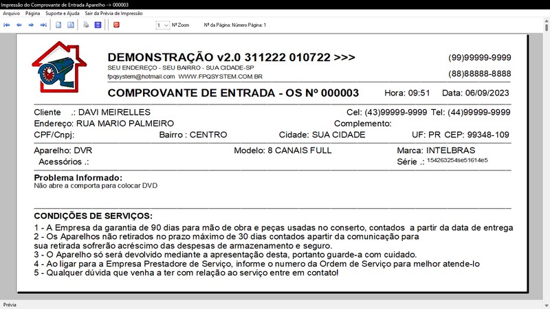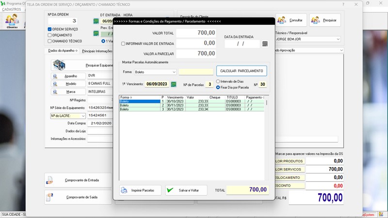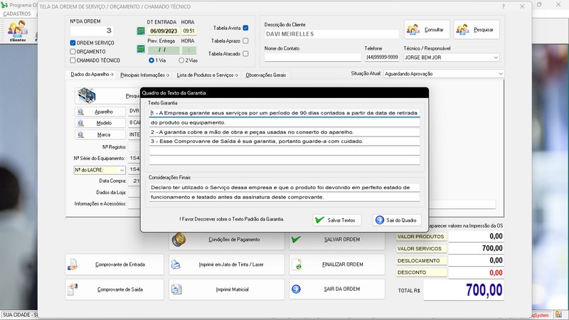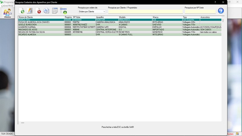 de Serviço / Orçamento / Clientes / Fornecedores / Técnicos / Relatório