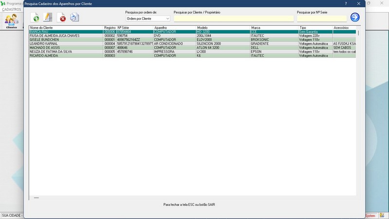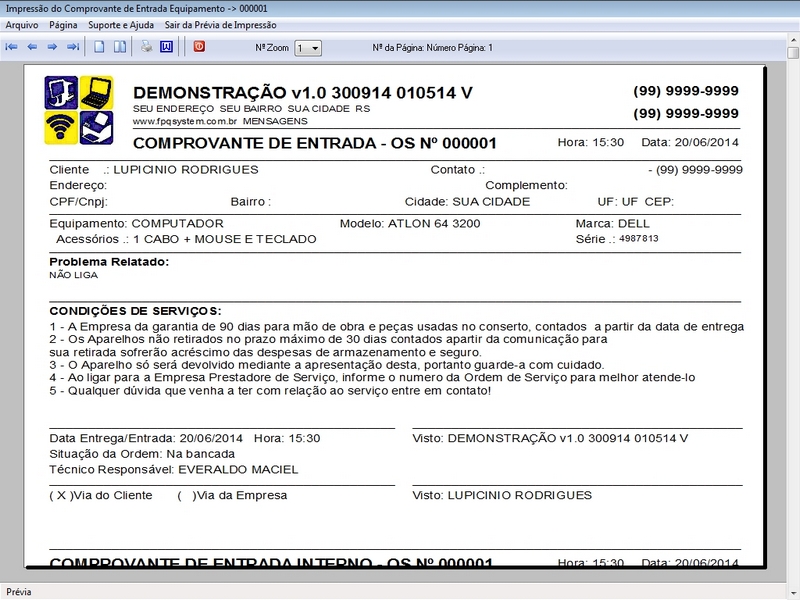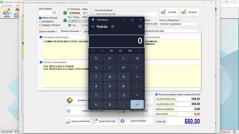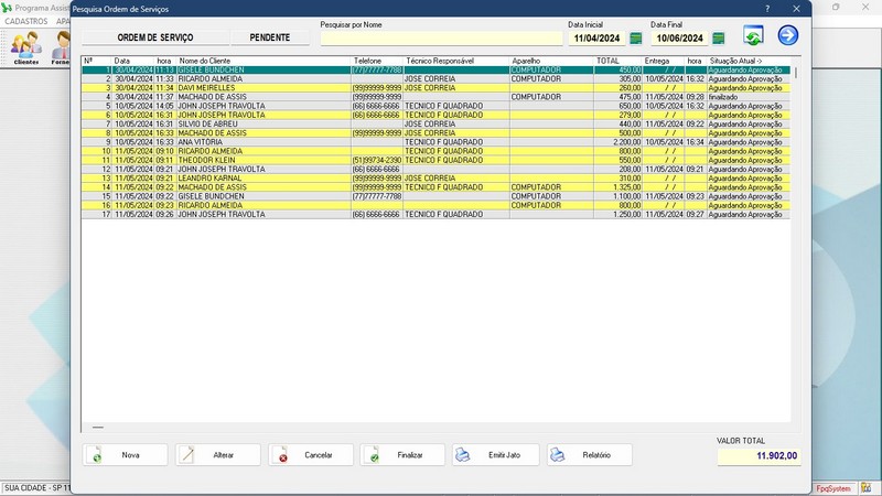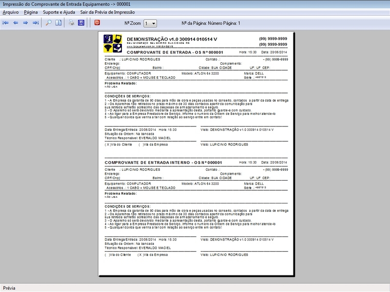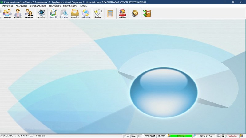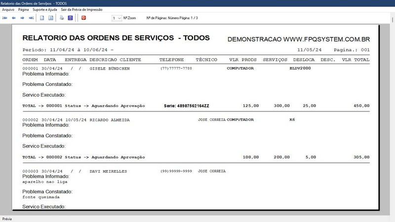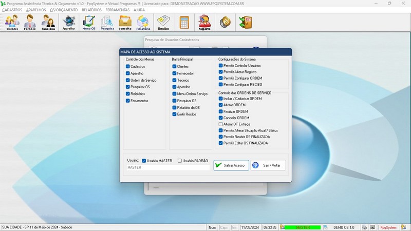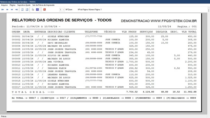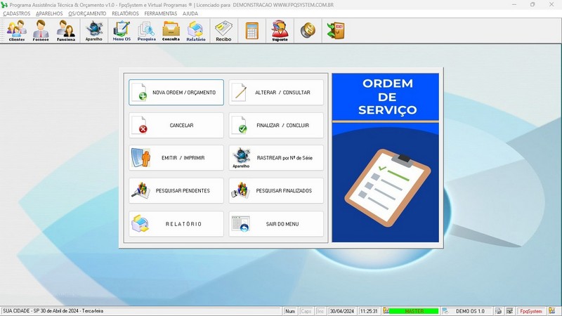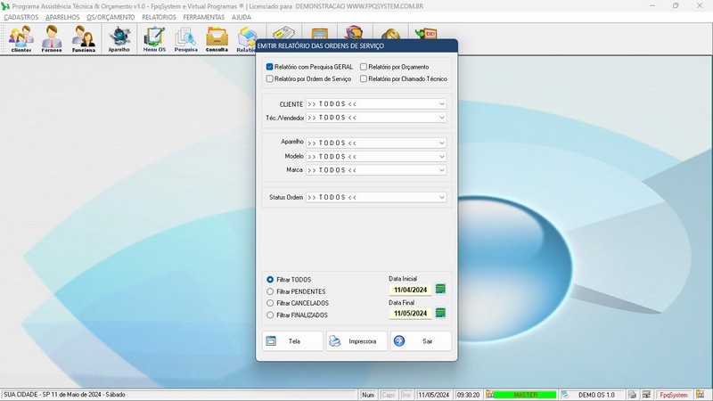 de Serviço / Orçamento / Clientes / Fornecedores / Técnicos / Relatório