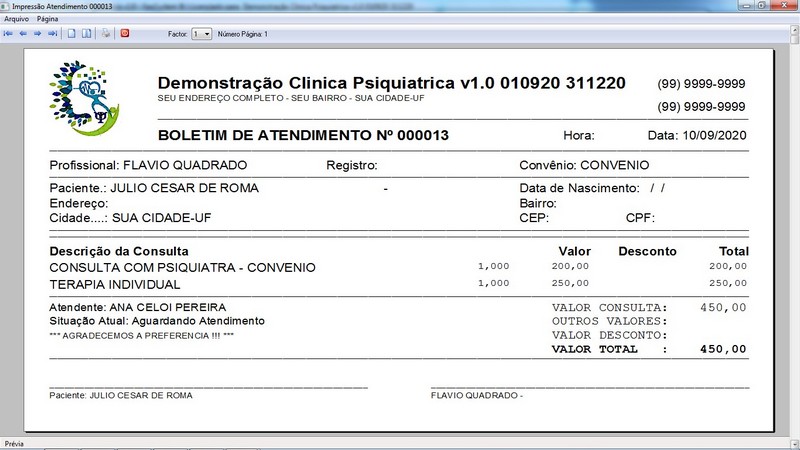 Preço / Recibo de Pagamento / Relatórios de Atendimentos / Personalizar