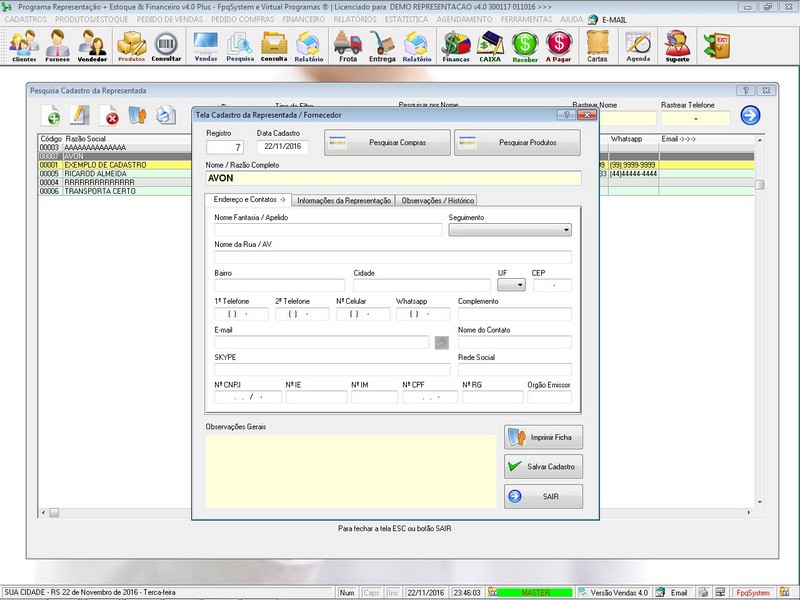 Tela Cadastro Fornecedor / Representada