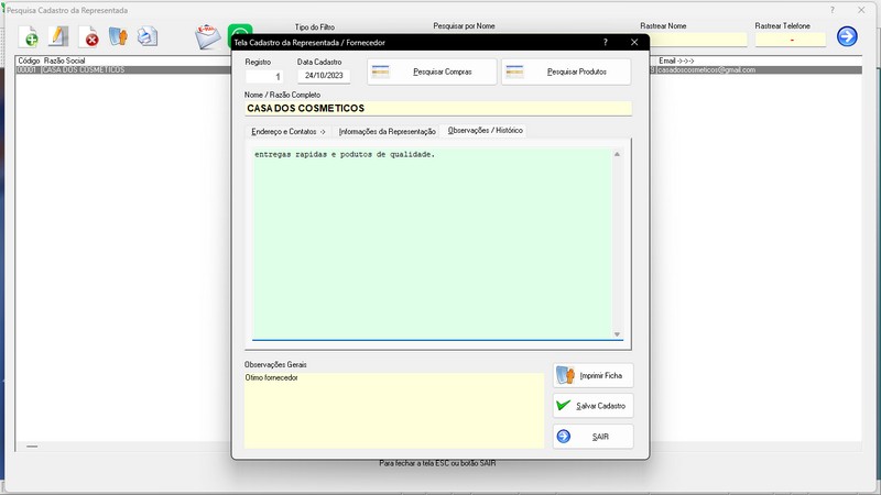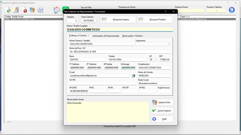 Orçamento / Clientes / Fornecedores / Representadas / Vendedores /