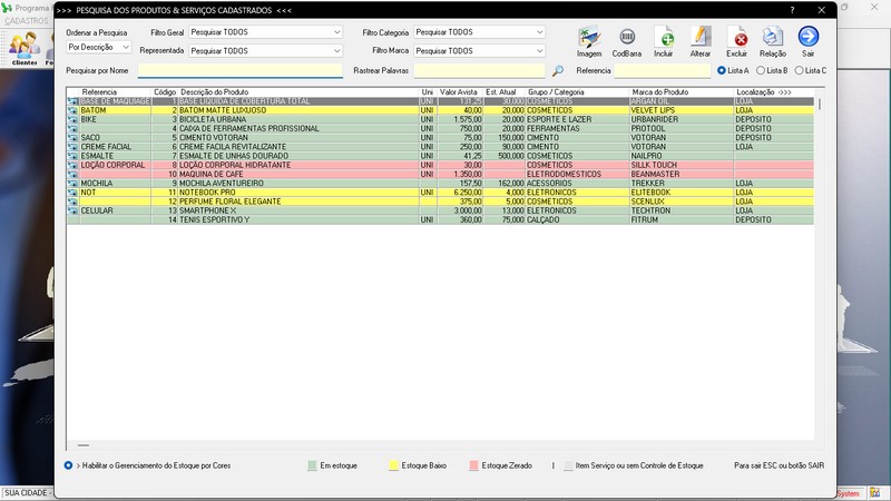 Tela Cadastro & Pesquisa de Produtos & Estoque