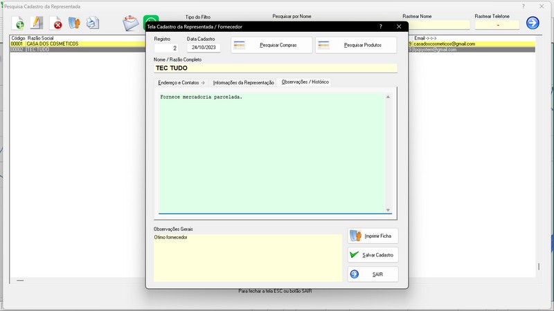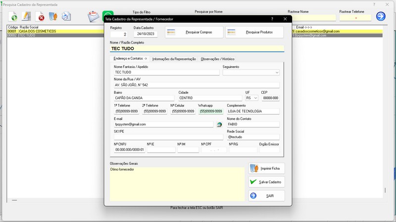 Orçamento / Clientes / Fornecedores / Representadas / Vendedores /