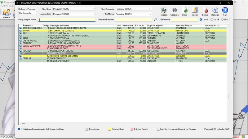 Tela Cadastro & Pesquisa de Produtos & Estoque