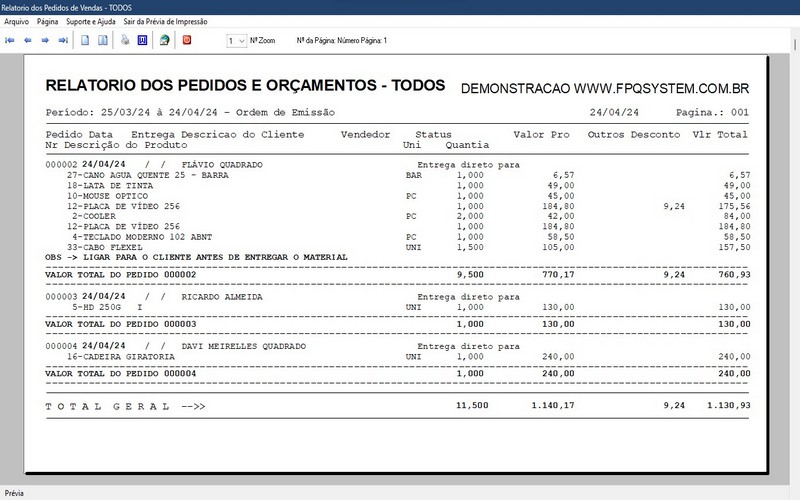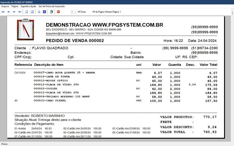 com impressão do pedido em A4 ou cupom não fiscal.