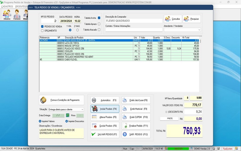 selecionando produtos, especificando quantidades, aplicando descontos,