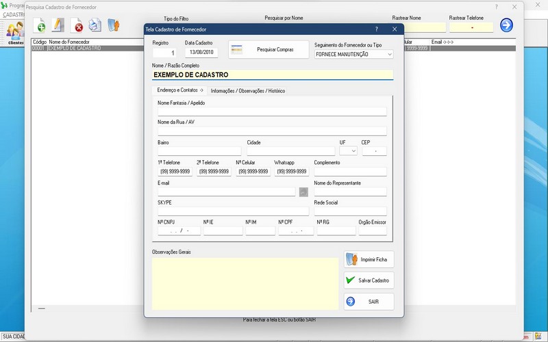 registro de informações sobre os fornecedores, como detalhes