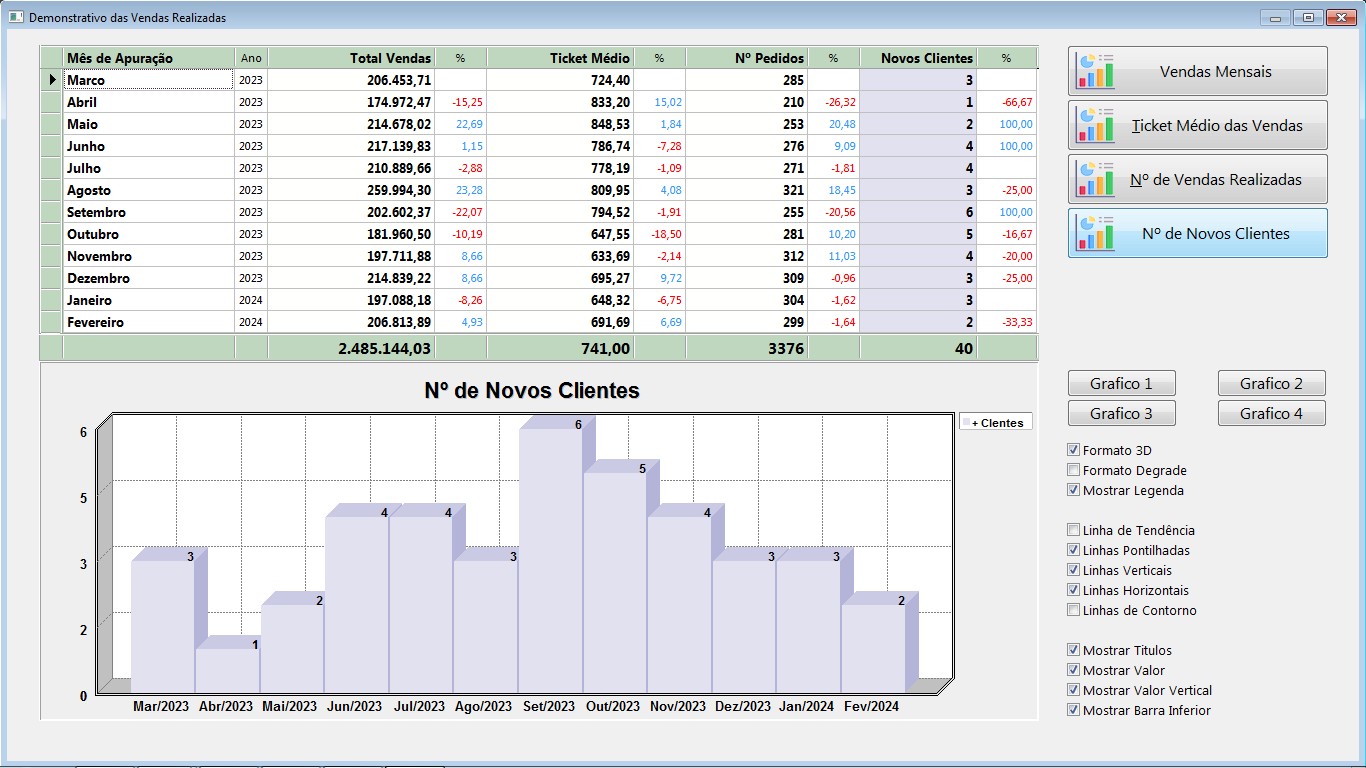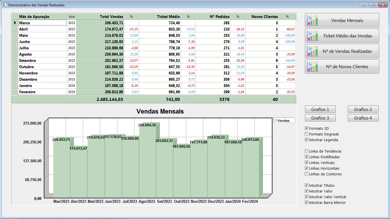 Permite analisar em gráfico, faturamento mensal ou anual.