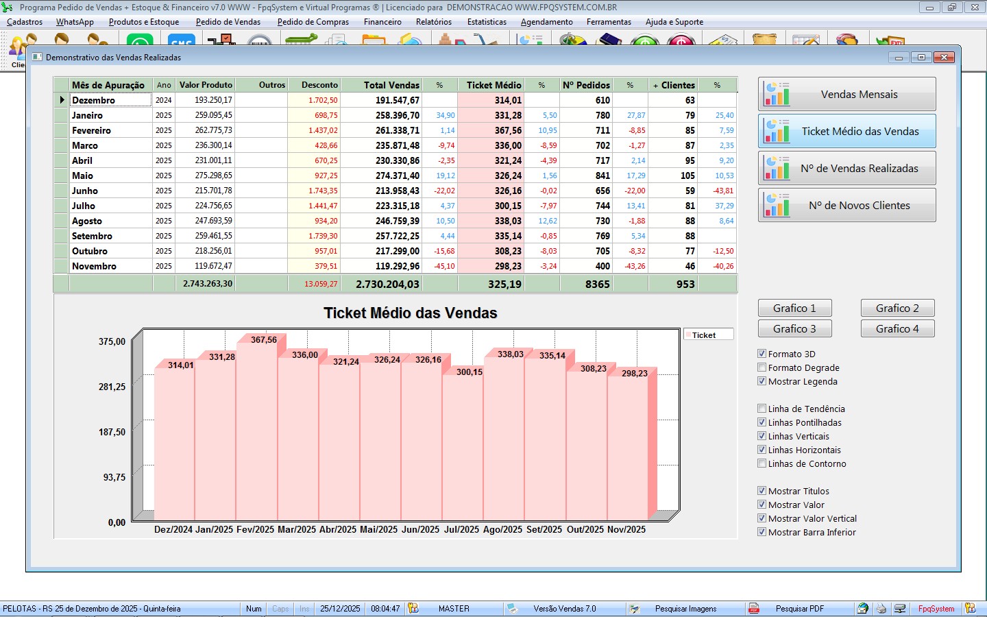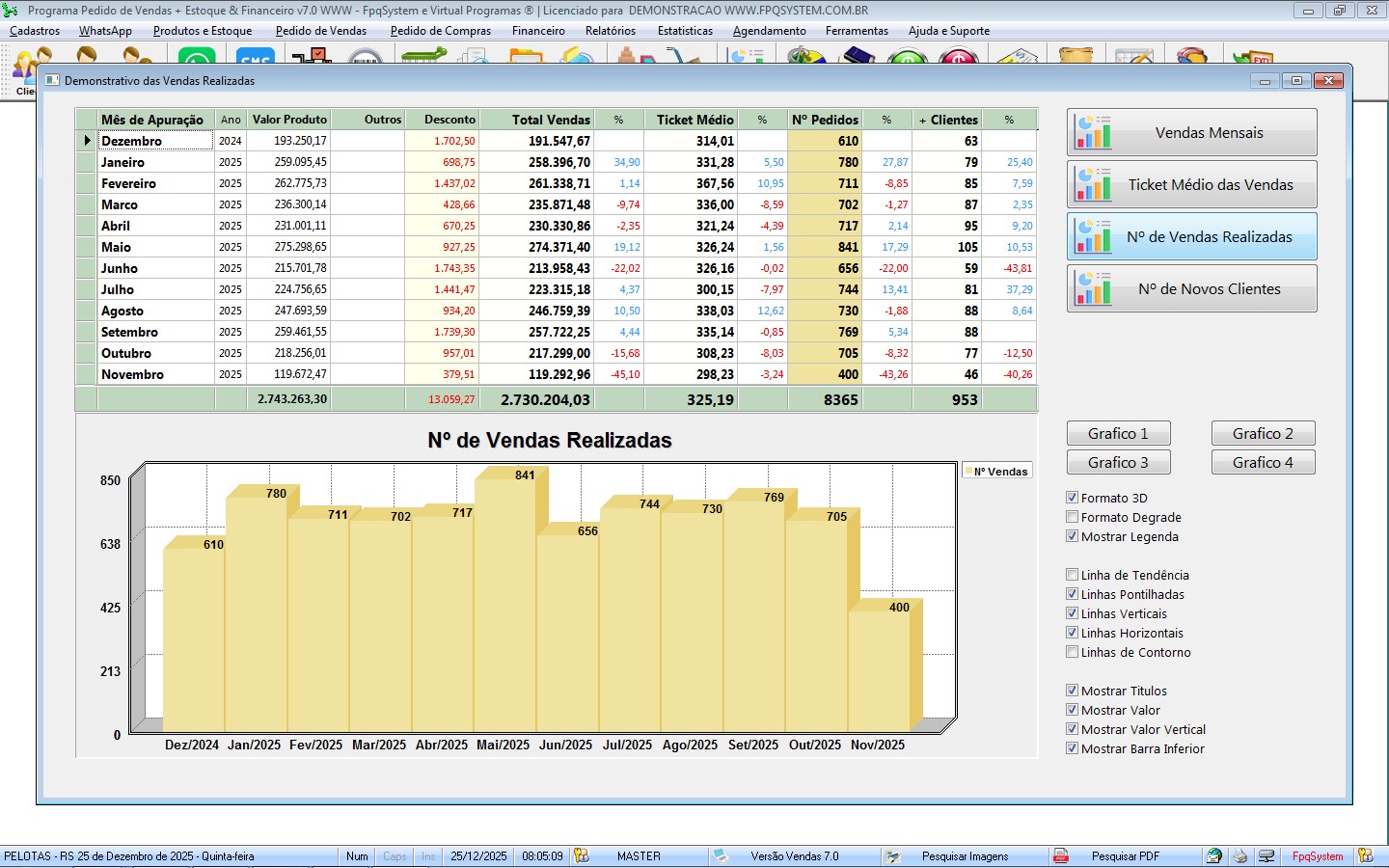 Permite analisar em gráfico, faturamento mensal ou anual.
