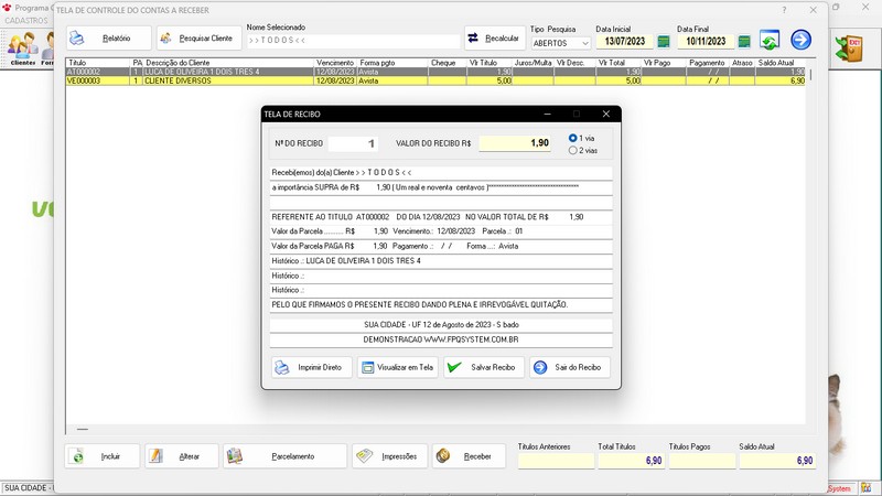 Receber / Recibo de Pagamento / Controle de Vacinas / Relatório das Vacinas + Enviar