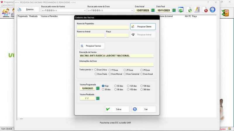 / Clientes / Fornecedores / Atendentes / Controle de Vacinas / Cadastro